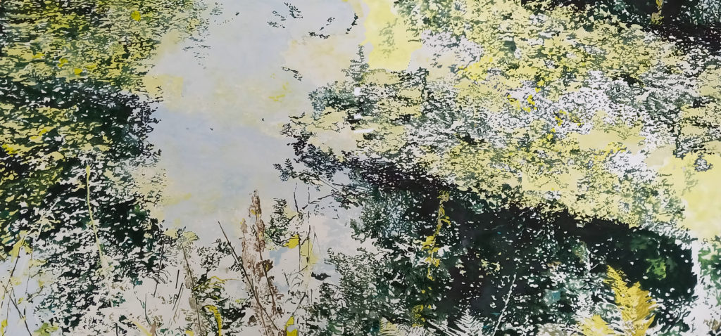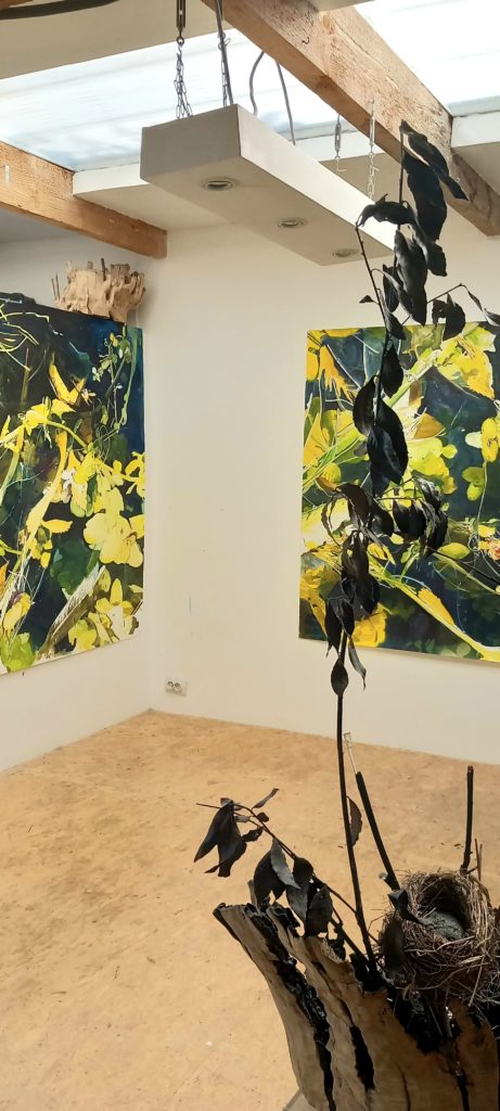 Le paysage a d’abord été pictural avant d’être réel. Paysage, comme morceau de pays, est le nom donné à cette nature idéalisée que les peintres représentaient au XVIe siècle. Face à la catastrophe écologique, une re-connexion à la nature s’est imposée : la marche précède désormais mon geste artistique, me rendant perméable aux transformations du paysage, à ses résistances et altérations. Il s’agit d’être dans le paysage, l’observer en marchant, le ressentir. Comme un laboratoire de recherches et de formes où la réflexion et la pensée artistiques se dévoilent progressivement en révélant leurs choix. La peinture accompagne, donne à voir et invente les transformations. Cette perception du paysage nous interroge sur ses représentations. Elle nous permet aussi de saisir les interrelations que nous entretenons avec les facteurs naturels et humains qui le modifient sans cesse.